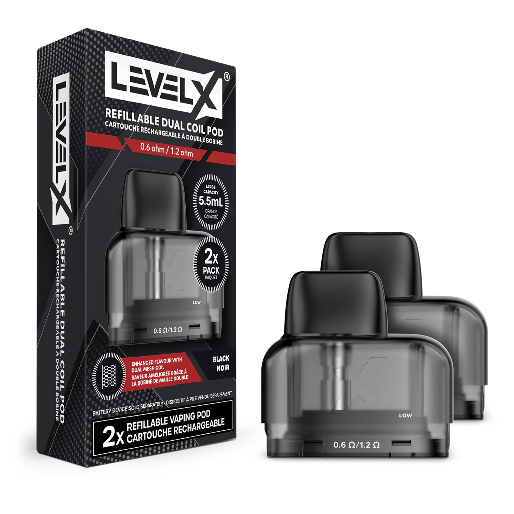 Introducing the Level X Refillable Pods: dual mesh coils for enhanced flavour, a 5.5ml capacity for fewer refills, and easy top filling (up to 6 times) with adjustable airflow for true next level value.