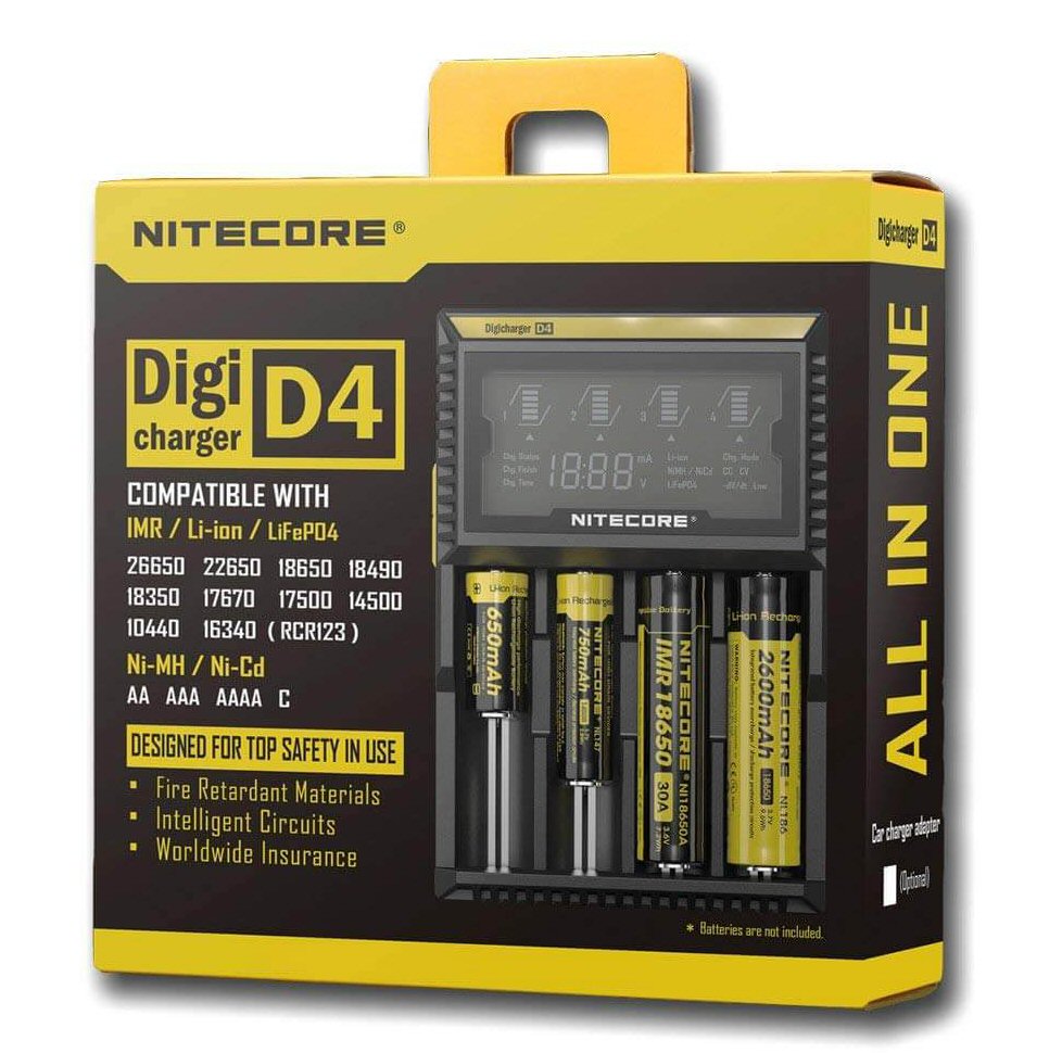 The Nitecore D4 universal quadruple charger is compatible with almost all cylindrical batteries. The charger automatically detects the IMR, LiFePO4, Li-ion, Ni-MH and Ni-Cd batteries and applies the appropriate charging mode, constant current charge or constant voltage charge.